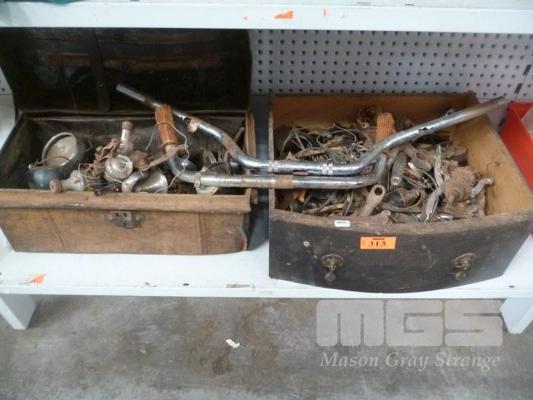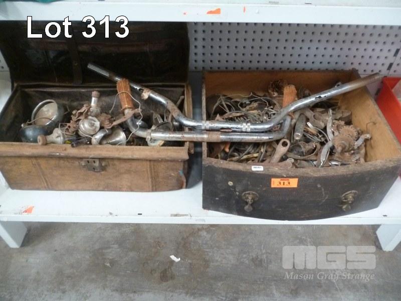 ASSORTED VINTAGE BICYCLE PARTS, 2 x TIMBER CRATES