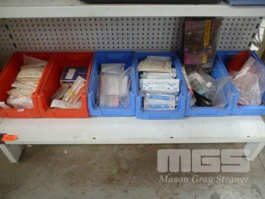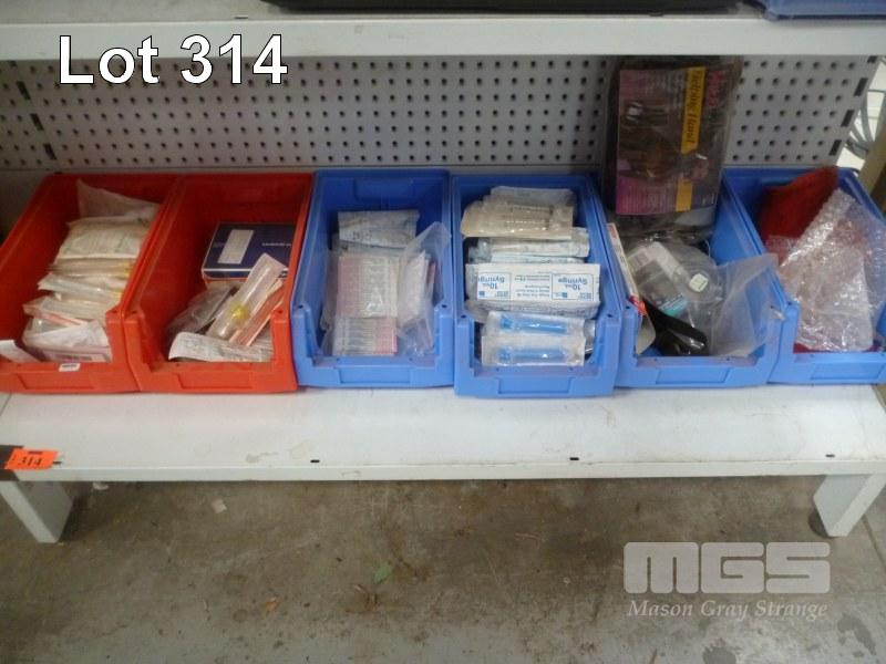 6 x PARTS TRAYS CONTAINING MEDICAL EQUIPMENT, SYRINGES, NEEDLES ETC