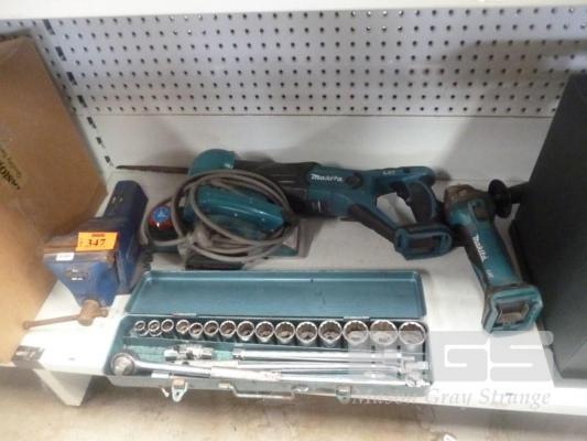 MAKITA ELECTRIC PLANER, MAKITA CORDLESS SAW & GRINDER (NO BATTERIES), BENCH VICE & IMPERIAL SOCKET SET