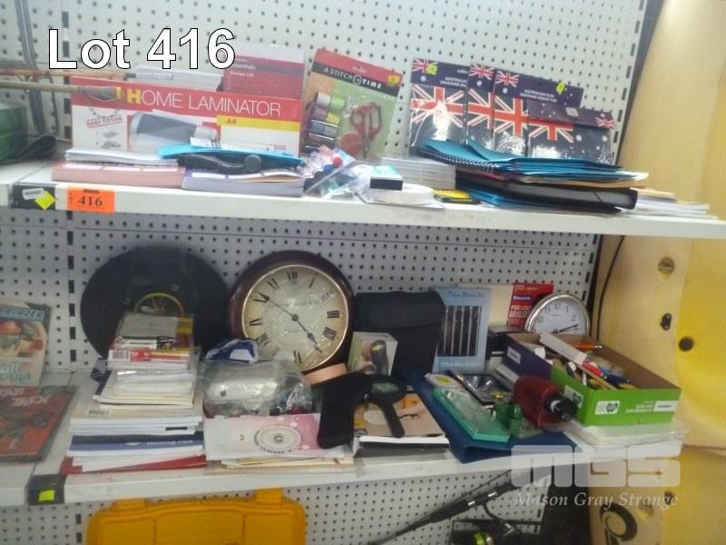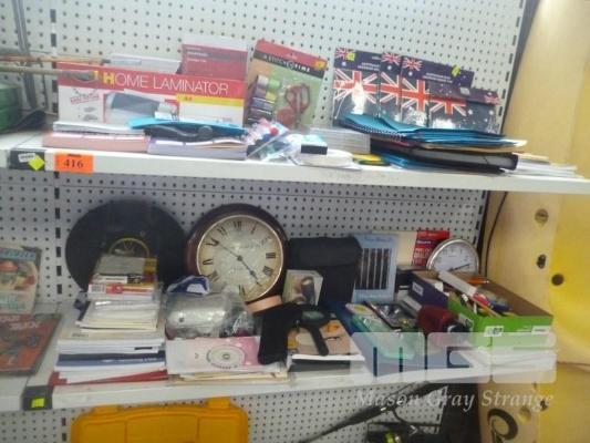 ASSORTED OFFICE STATIONERY, BINOCULARS, HOME LAMINATOR, CLOCKS, ETC, 2 x SHELVES