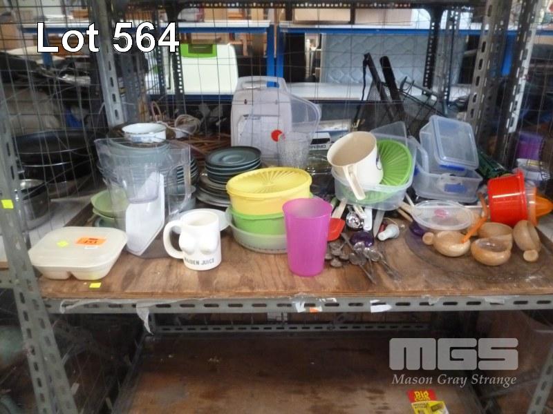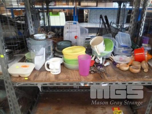 ASSORTED DINNERWARE, STORAGE CONTAINERS, ETC