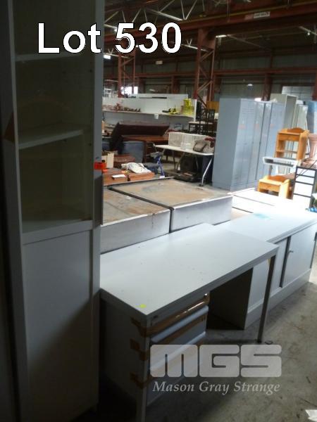 3 x PIECES GREY MELAMINE OFFICE FURNITURE, DESK, LOWLINE CABINET, WITH KEY & NARROW SHELF UNIT, SINGLE DOOR
