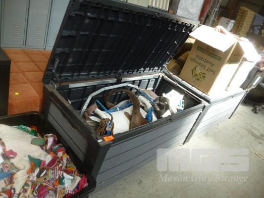 2 x LARGE PLASTIC STORAGE TRUNKS, CAMEL SADDLE, DRESSAGE ACCESSORIES ETC