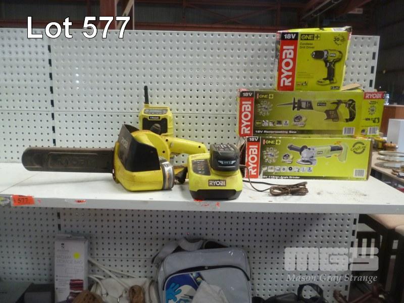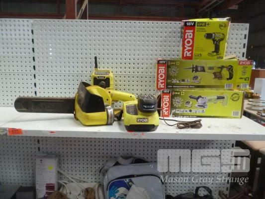 RYOBI CORDLESS DRILL, RECIPROCATING SAW, ANGLE GRINDER, CHAINSAW & BLUETOOTH RADIO, WITH CHARGER & 3 x BATTERIES