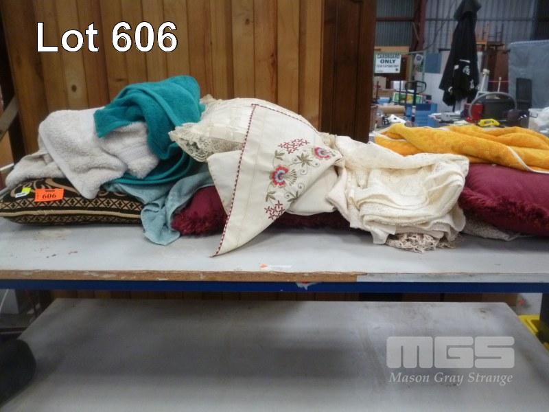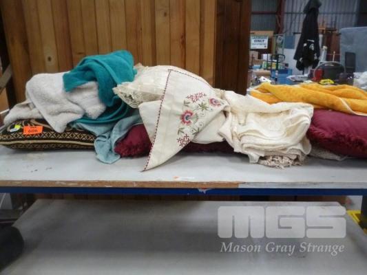ASSORTED DOILIES, CUSHIONS, TOWELS, ETC