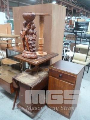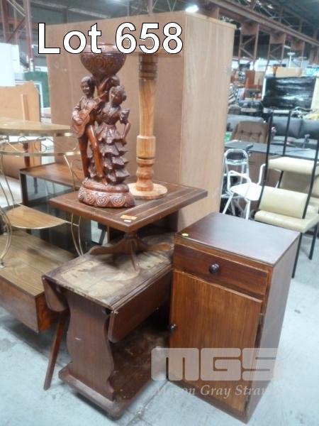 MOBILE, TIMBER DROP SIDE TABLE, TIMBER SIDE TABLE, PINE PEDESTAL, TIMBER CABINET & PLASTIC SMOKERS STAND (NO ASHTRAY)