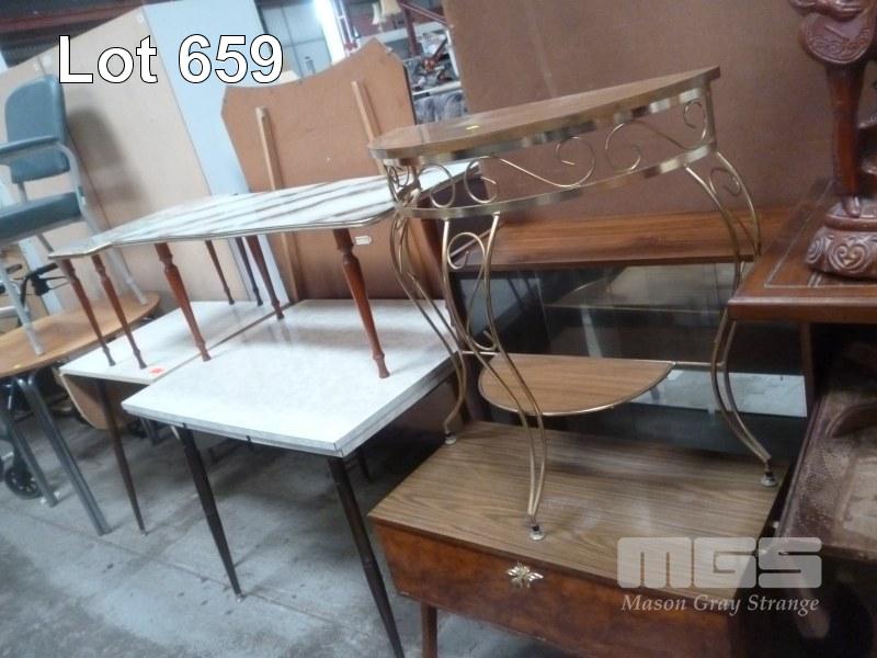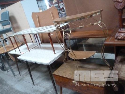 ASSORTED LAMINATE TABLES INCLUDING DROP SIDE TABLE,EXTENSION TABLE, COFFEE TABLE, SIDE TABLE, HALF ROUND TABLE, CHINA CABINET & RECORD TABLE