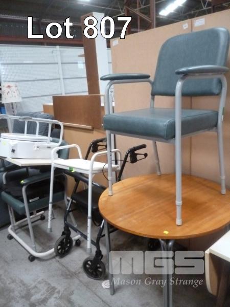 ASSORTED ASSIST CHAIRS, MOBILITY WALKER, MOBILE TABLE & ROUND DINING TABLE