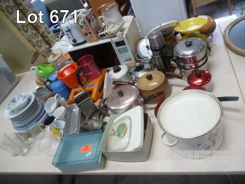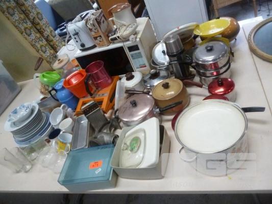 ASSORTED KITCHENWARE & COOKWARE, MICROWAVE, TOASTER, SANDWICH PRESS, ETC, 1 x TABLE