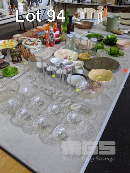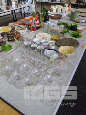 GLASSWARE, CERAMICWARE & BASHED BRASS PLATE. 1 x TABLE.