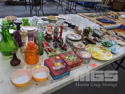 VINTAGE TINS, COLOURED GLASSWARE & HOMEWARES. 1 x TABLE.