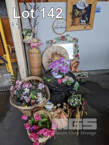ASSORTED ARTIFICIAL FLOWERS, WALL SHELF, CANE WARE, ETC