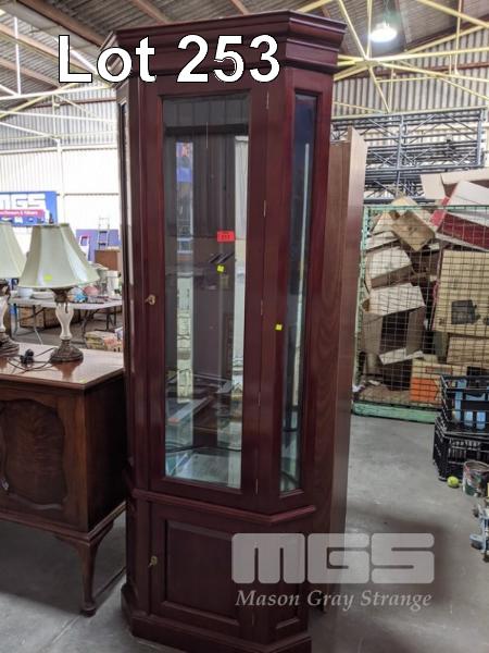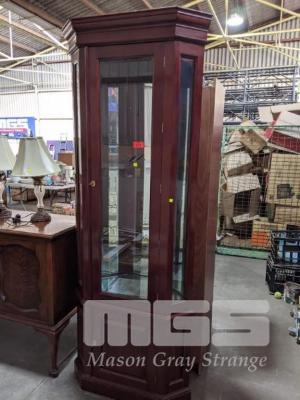 MAHOGANY CORNER DISPLAY CABINET WITH BEVELLED GLASS &MIRROR BACK, HALOGEN INTERNAL LIGHT, PURCHASED FROM WOHLERS, 2012, $1788.00