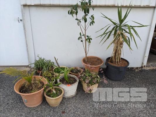 ASSORTED POTTED PLANTS INCLUDING FICUS, PALMS, FRANGIPANIS, ETC