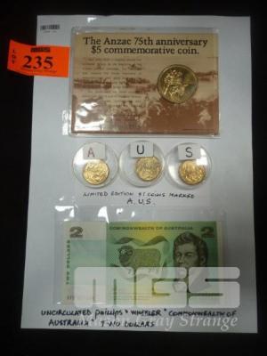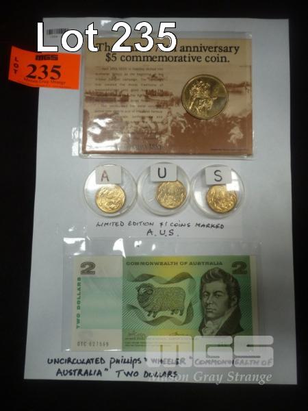 COMMONWEALTH OF AUSTRALIA, $2 BANKNOTE, PHILLIPS/WHEELER (UNC), SET OF 3, $1 COINS, MARKED A.U.S.