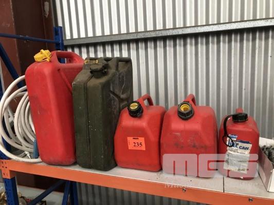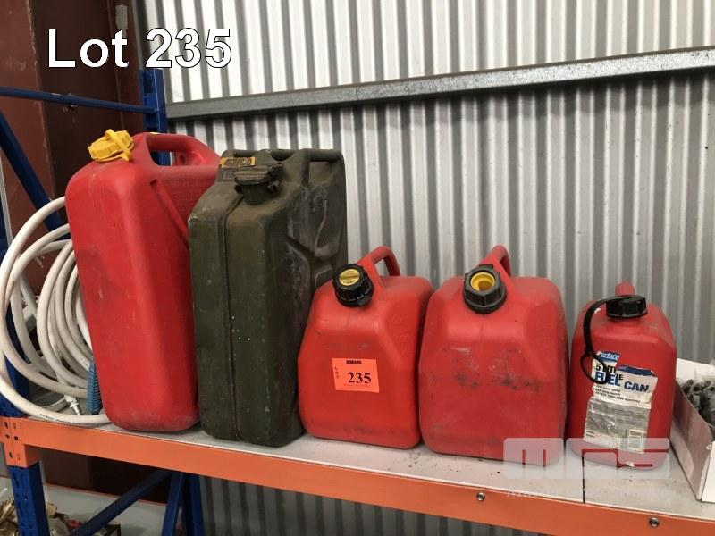 5 x ASSORTED JERRY CANS, (20 LITRE POLY, 20 LITRE TIN, 2 x POLY 10 LITRE & 1 x POLY 5 LITRE) & AIR HOSE