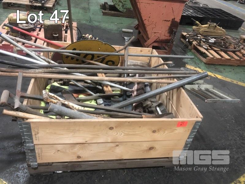 ASSORTED LANDSCAPING TOOLS INCLUDING SHOVELS, CROW BARS, JIMMY BARS, LOLLY POP SIGNS, BROOMS, SCREED, ETC