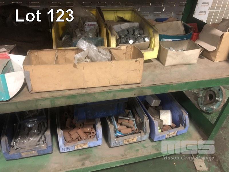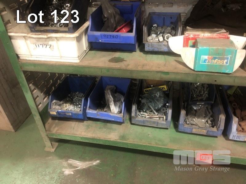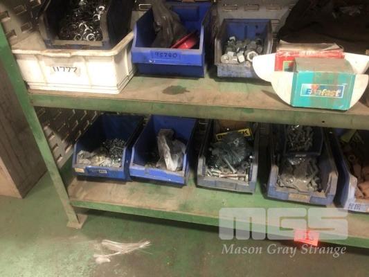 ASSORTED HARDWARE, NUTS,BOLTS, NYLOCK, STEEL SLEEVES & WASHERS (2 x LOWER SHELVES) (NOT INCLUDING RACK)