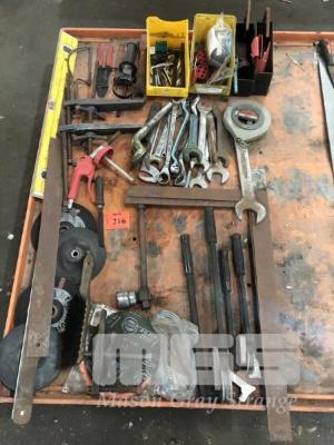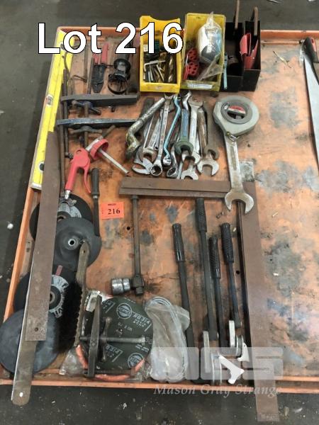 ASSORTED SPANNERS, TUBE BENDERS, LEVEL, ALLEN KEYS, CUTTINGS DISCS, ETC
