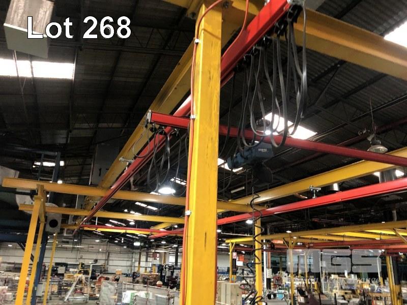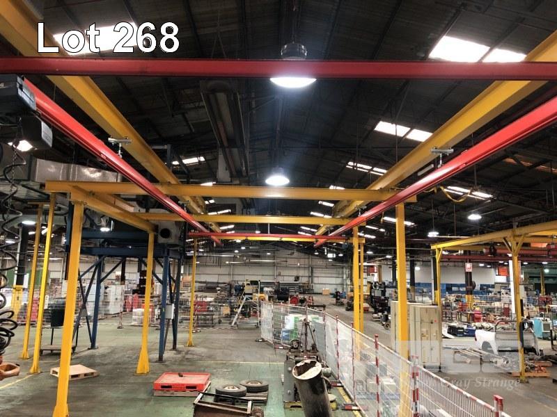 FREESTANDING OVERHEAD LIGHT CRANE SYSTEM WITH 250kg ELECTRIC HOIST & 125kg HOIST DEMAG HOIST CHAIN TYPE APPROX 20m TRAVEL 4m CROSS TRAVEL APPROX 8 x COLUMNS APPROX 3.9m (H) (COMPLETELY DEMOUNTABLE, NOT WELDED) (BUYER TO REMOVE) (OHS STRICTLY APPLIES)