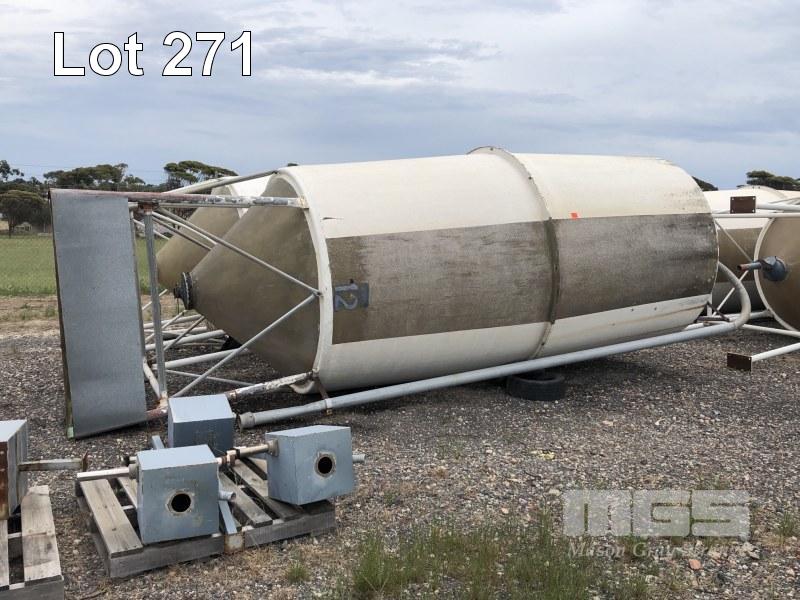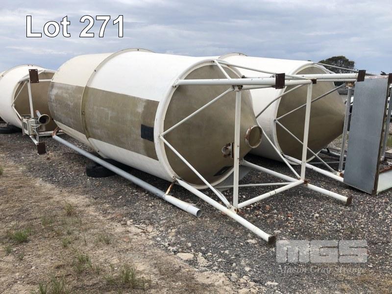 2 x FIBREGLASS UPRIGHT HOPPERS 2.2m DIAMETER 7.5m (H) INCLUDES STAND 6.4m (H) SILO PLUS CONE 18m3