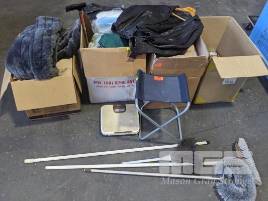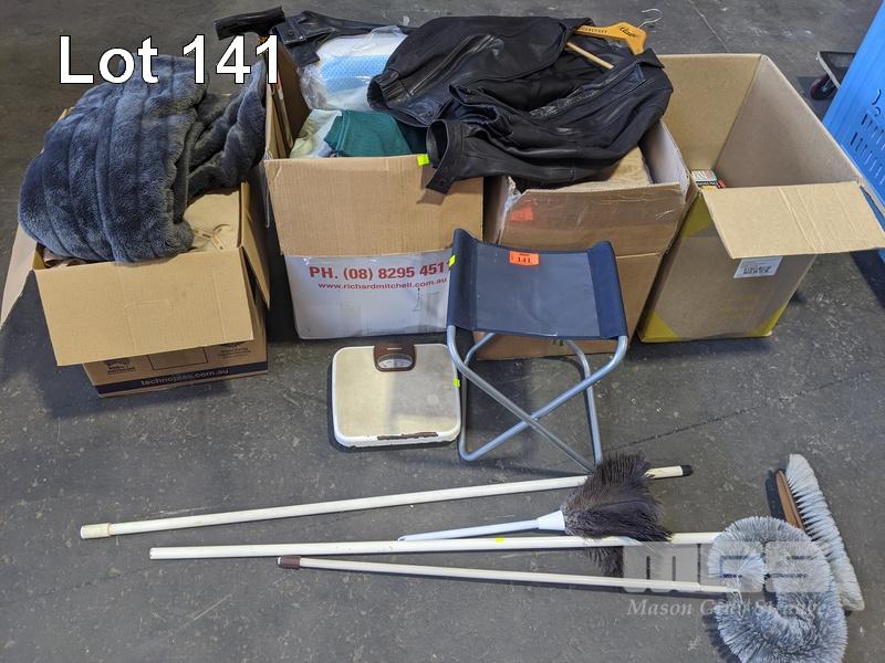 1 x BOX BOOKS, BLACK LEATHER JACKET, 3 X BOXES BLANKETS, PILLOWS, ETC