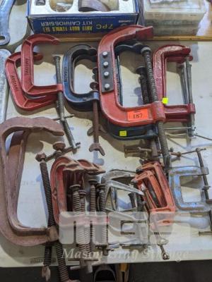 ASSORTED G-CLAMPS, 4 x 10", 2 X 8", 4 x 6", 6 x 4" & 6 x 3"