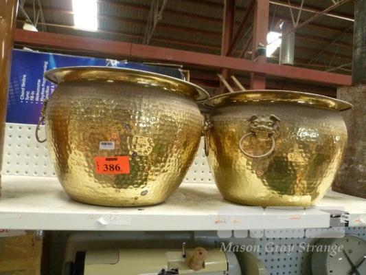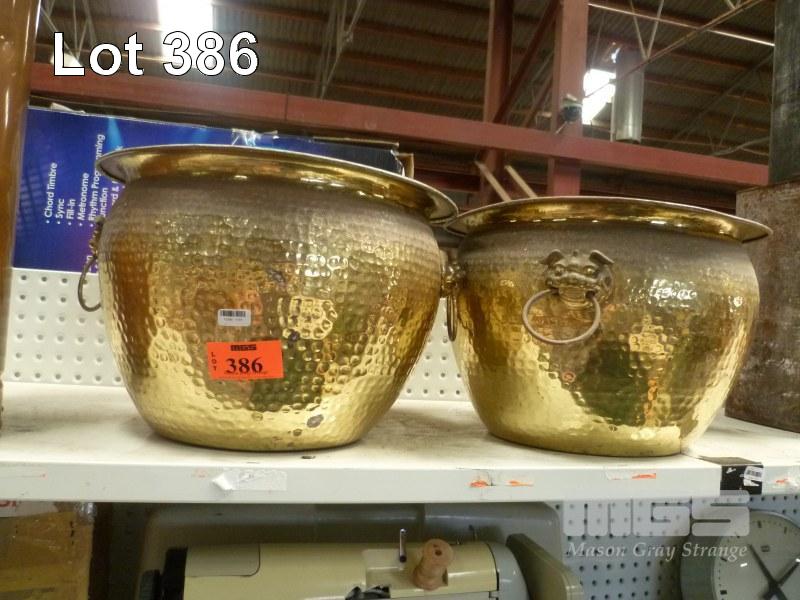PAIR BRASS POTS WITH MEDIEVAL HANDLES 36cm ROUND x 26cm HIGH