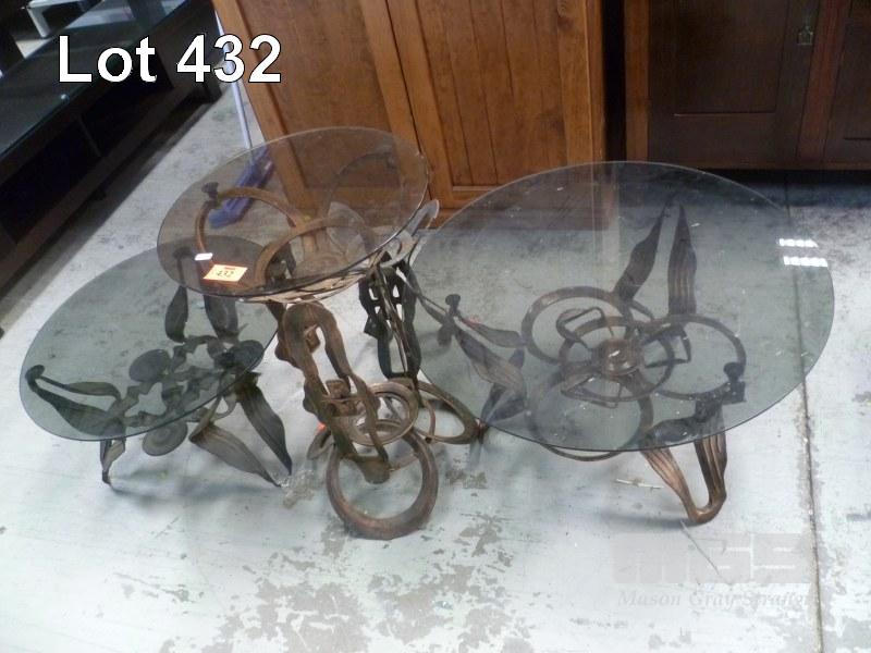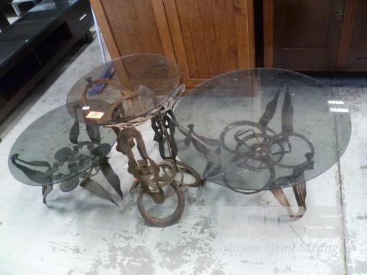 2 x ROUND COFFEE TABLES, METAL BASE, SMOKE GLASS TOPS & OCCASIONAL TABLE