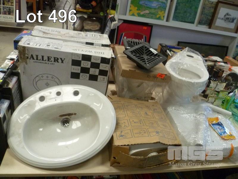 PAIR CERAMIC VANITY BASINS, GEMINI S-TRAP TOILET BASE, WHITELEY S-TRAP TOILET BASE, CAROMA CISTERN & PLASTIC GRATES