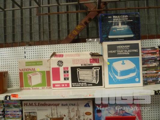 RETRO KITCHEN APPLIANCES, INCL GE VERTICAL GRILL, HOOVER ELECTRIC FRYPAN & NATIONAL AUTOMATIC TOASTER