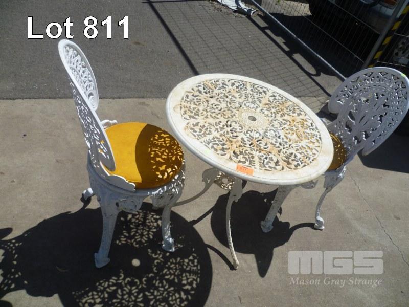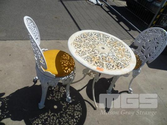 WHITE PAINTED CAST ALUMINUM 3 PIECE OUTDOOR SETTING, 2 x CHAIRS & ROUND TABLE