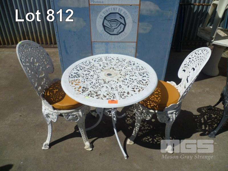 WHITE PAINTED CAST ALUMINUM 3 PIECE OUTDOOR SETTING, 2 x CHAIRS & ROUND TABLE