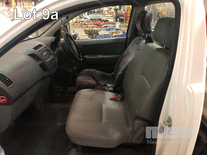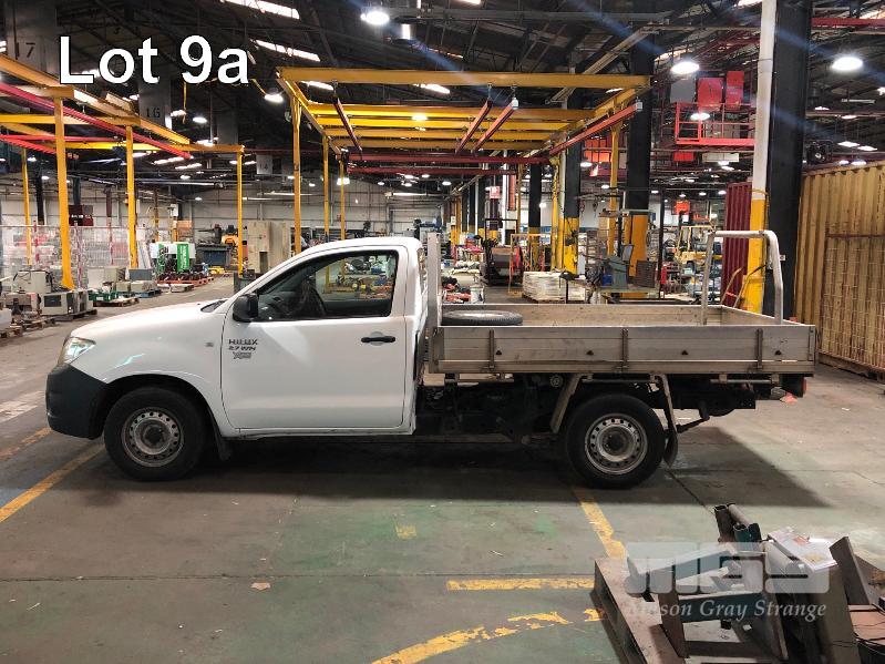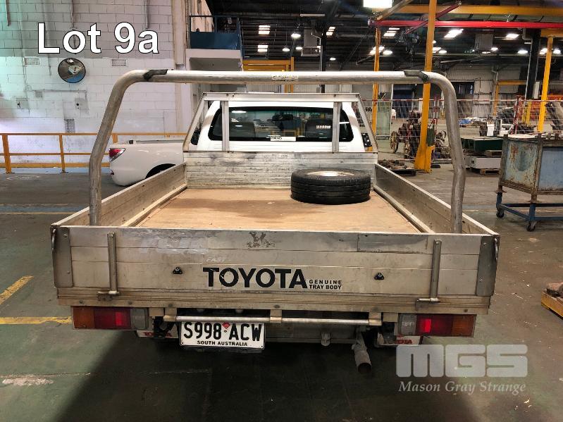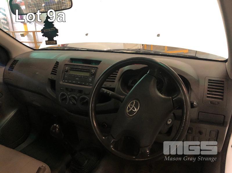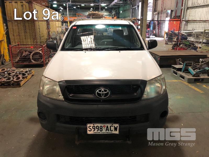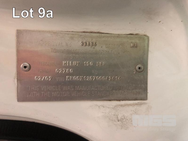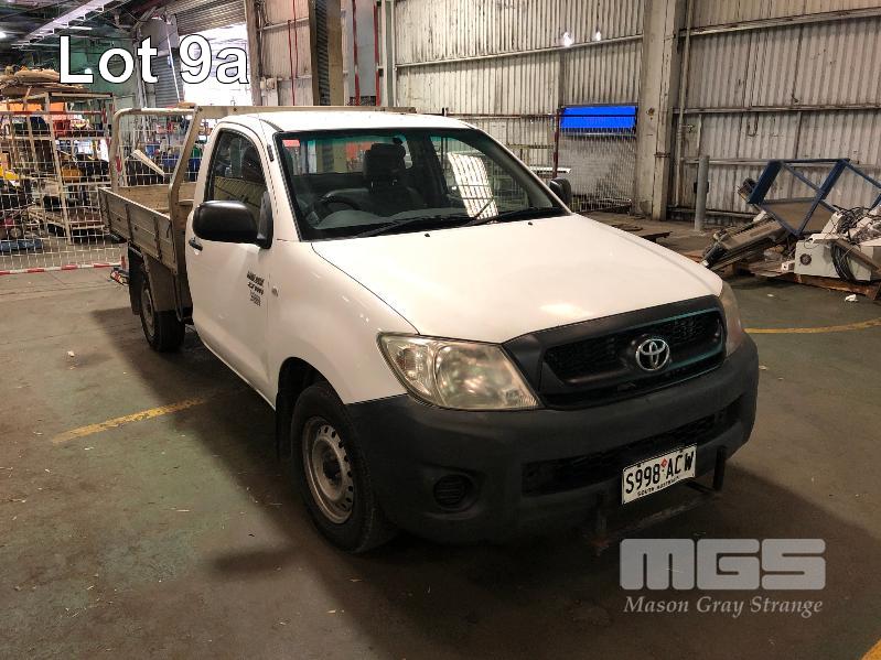 2009 TOYOTA HILUX WORKMATE 2.7 VTi 150 SERIES SINGLE CAB UTILITY REG: S998 ACW (SA) VIN: MR0CX12G700043616 ENG: 2TR6679621 ODO: 615,000kms SHOWING 5 SPEED MANUAL TRANSMISSION, PETROL/LPG, WHITE DUCO, 2 DOORS, 3 SEAT, AIR CON, CD PLAYER, SPARE WHEEL, GVM: 2,780kg DUAL AIR BAG DROP SIDE GENUINE TOYOTA ALLOY TRAY, 2400 x 1760mm (2 x PALLETS) LADDER RACKS KEY #43 (WITH PAPERS, WITH 1 KEY/S, WITH OWNER'S MANUAL, NO SERVICE BOOKS) CONDITION: - SLIGHT MISS AT IDLE - MINOR SCRATCHES