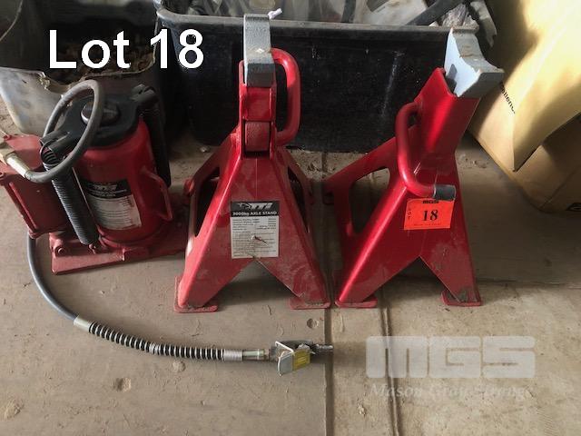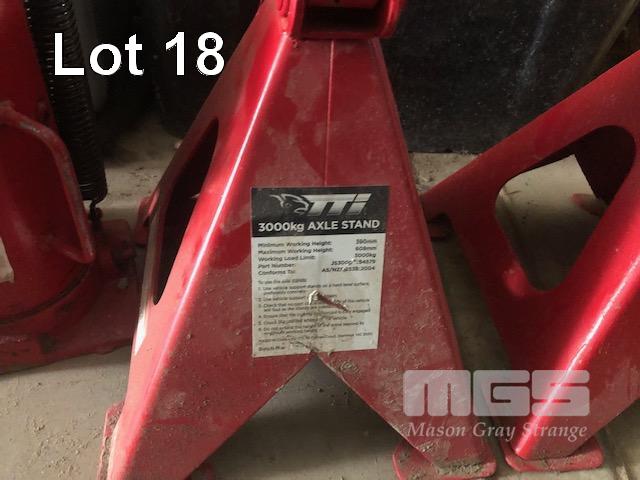2 x HEAVY DUTY TTI, 3,000kg RATED VEHICLE STANDS & TTI PNEUMATIC/HYDRAULIC BOTTLE JACK, 20T RATED