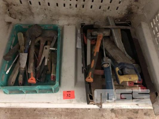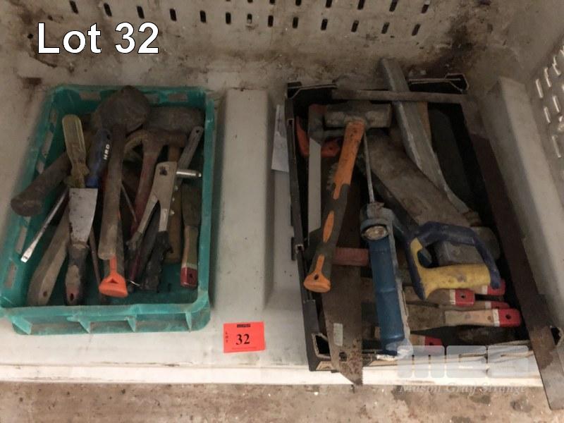 ASSORTED HAND TOOLS, HAMMERS, SAWS, SPANNERS, POP RIVET GUN, SCRAPERS & MORE, 2 x TRAYS