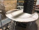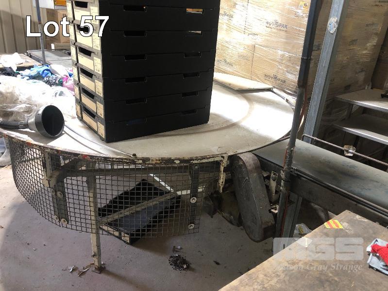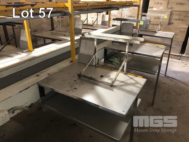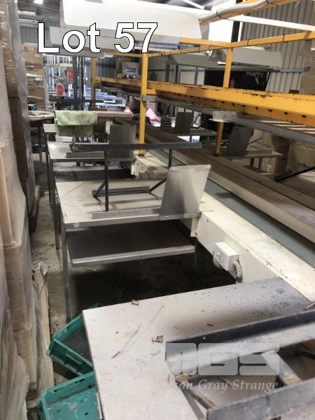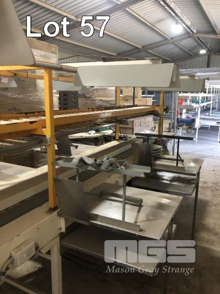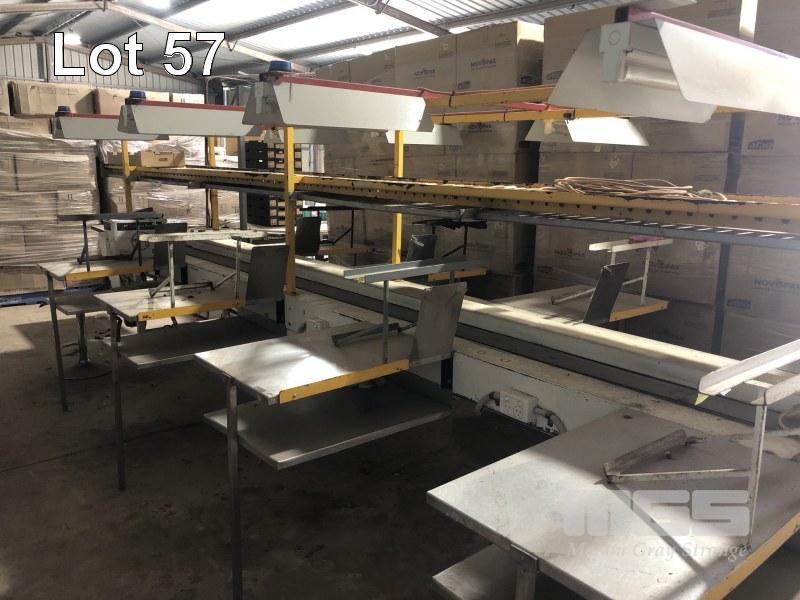 PACKING LINE 2 x 8 STATION UNITS DOUBLE SIDED, APPROX 6m LONG , SUIT PUNNETS WITH DUAL SIDED CONVEYOR BELTS, 130mm (W), 240V & OVERHEAD GRAVITY ROLLERS. . 10 x OVERHEAD FLURO LIGHTS STAINLESS STEEL WORK STATIONS WITH PACKING FRAMES & COMMON CIRCULAR BOXING STATION