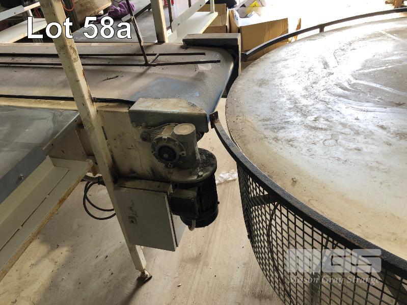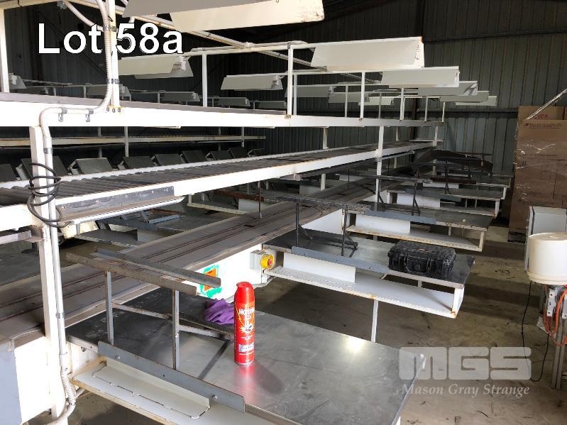 PACKING LINE 480mm (W) BELT CONVEYOR, 9m (L) APPROX 12 x OVERHEAD FLUROS 240V DRIVE MOTOR OVERHEAD ROLLERS, 2 LEVELS WITH MULTIPLE GPO'S, ROTARY TABLE & DRIVE WITH OVERHEAD FLURO LIGHTING