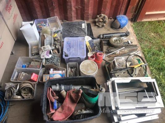 ASSORTED HARDWARE, PARTS, HOSE, CHAIN, CLAMPS, STAKES, ETC