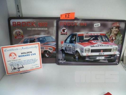 AUTOGRAPHED PETER BROCK MONARO CV8 COA & HOLDEN TORANA EMBOSSED SIGNS x 2