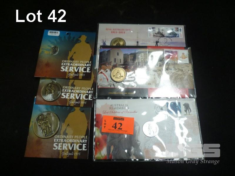 3 X MILITARY FIRST DAY COVERS WITH COMMEMORATIVE COINS, GALLIPOLI MEDALION, PIN & KEYRING