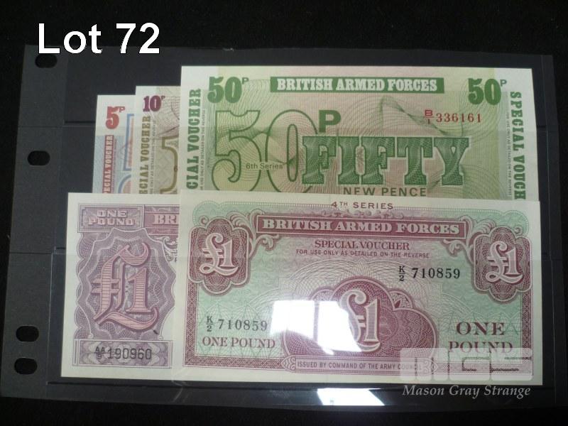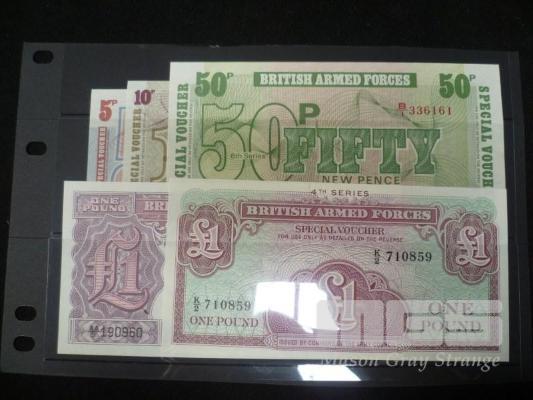 5 X BRITISH ARMED FORCES NOTES 5P,10P,50P, 2 X 1 POUND NOTES APPEAR UNC
