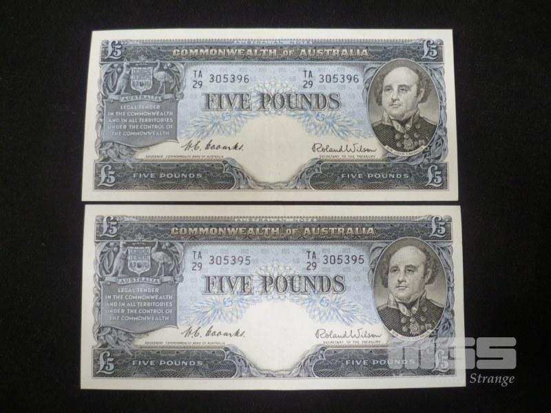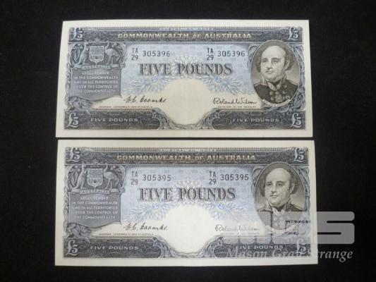 1954 2 X 5 POUND NOTES COOMBS WILSON APPEAR UNC