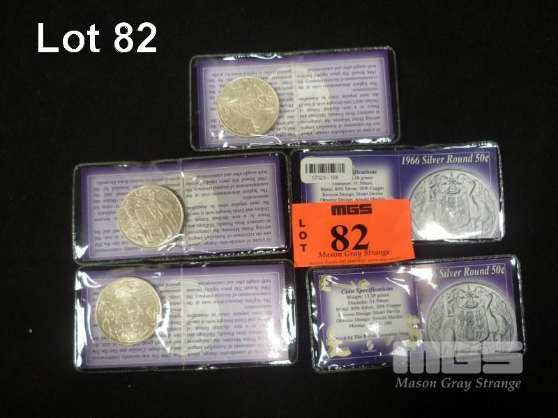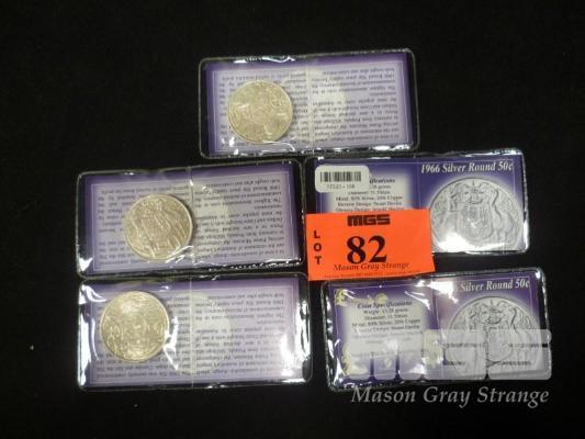 5 X AUSTRALIA, 1966 ROUND 50c COINS IN SHERWOOD PLASTIC SLEAVES