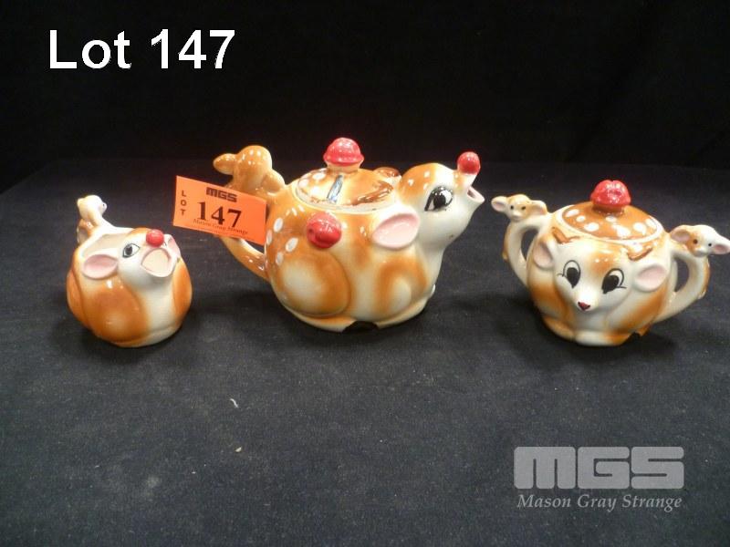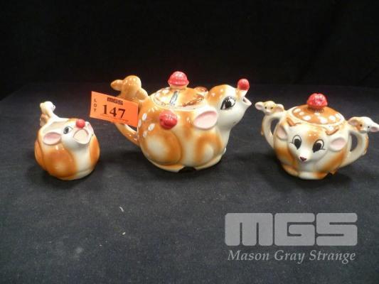 RUDOLPH THE RED NOSE RAINDEER TEA SERVICE, TEAPOT, SUGAR BOWL & CREAMER