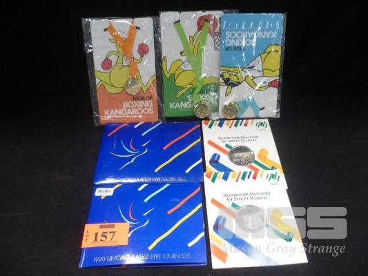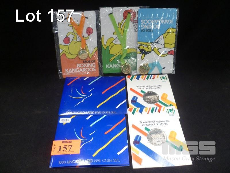 2 X NEW ZEALAND, 1990 UNCIRCULATED FIVE COIN SETS, 3 X AUSTRALIA, $1 COLOURED UNC COINS, BOXING KANGAROOS, 2 X AUSTRALIA, BICENTENNIAL MOMENTO FOR SCHOOL STUDENTS TOKEN