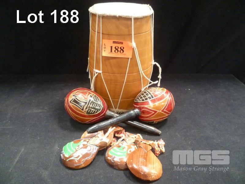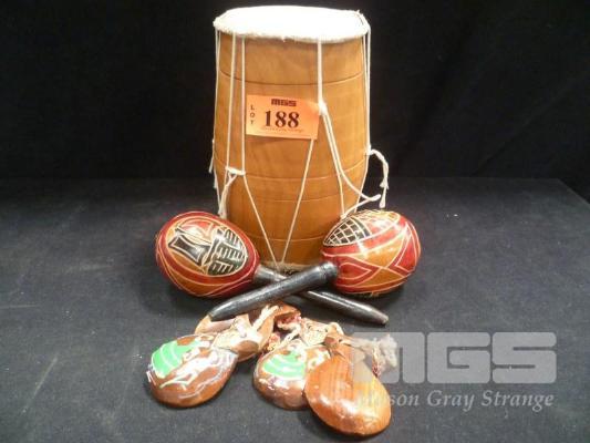 TRIBAL DRUM, PAIR OF MARACAS & CASTANETS