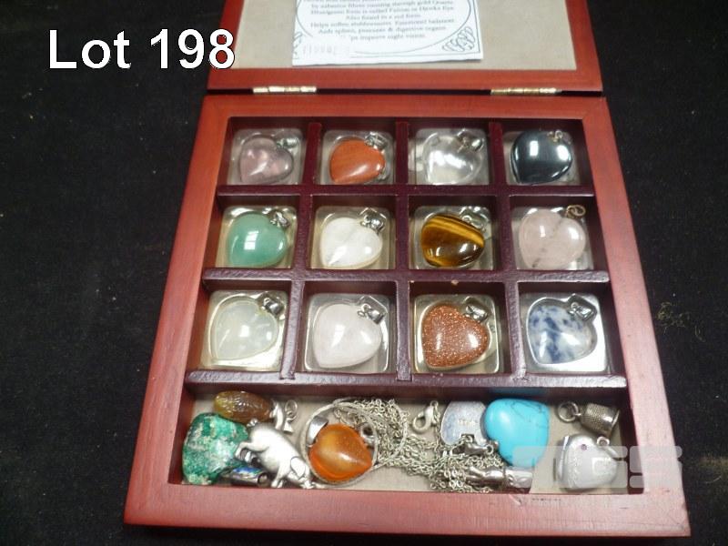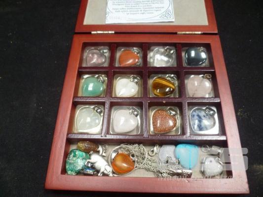ASSORTED SEMI PRECIOUS PENDANTS WITH SOME SILVER IN TIMBER CASE