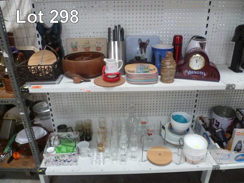 ASSORTED GLASSWARE, DINNERWARE BOWLS, TINS, ETC. (2 x SHELVES)