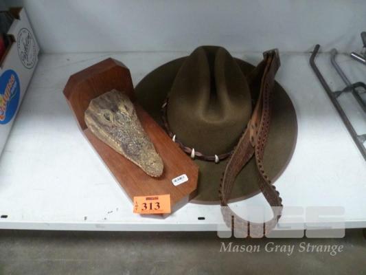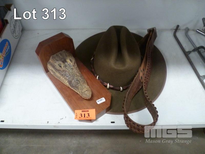 TAXIDERMY CROCODILE HEAD, TOOTH HAT & 22 BELT